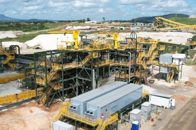 Complexo industrial com maquinário e grandes tubulações, em meio a montes de minério branco. A imagem representa a exploração de lítio em Minas Gerais.